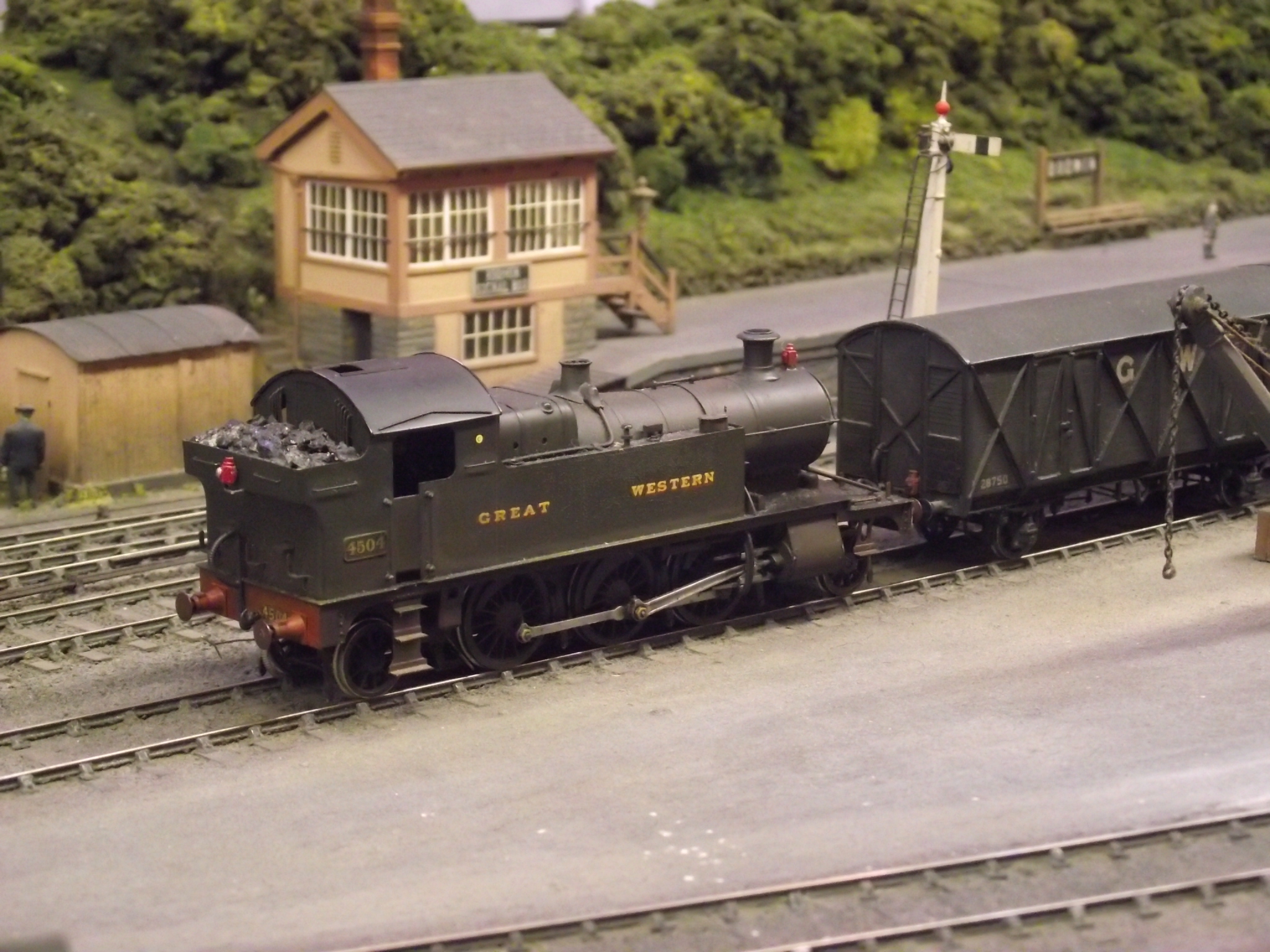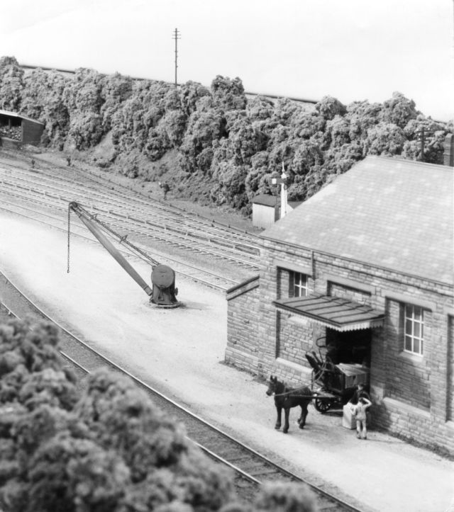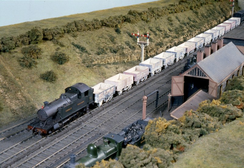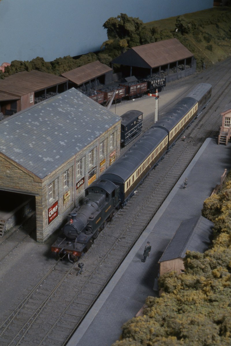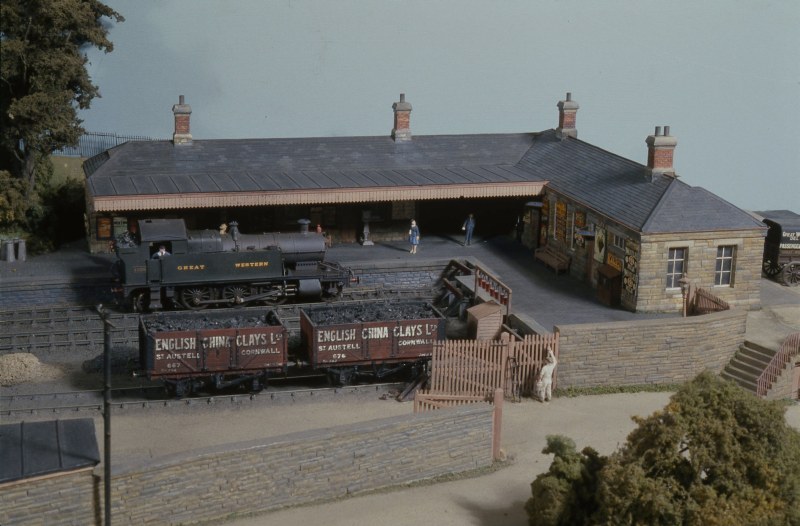 The model of this Cornish branch line terminus was built to exact scale length by members of the NLG, and portrays the prototype as running in 1926 when GWR Prarie tanks and new 'B Set' coaches were introduced on the service. The branch was built in 1887 from the main line at Bodmin Road to Bodmin (later Bodmin General) station. In 1888 a further branch was completed from the terminus to Boscarne Junction where there was a junction with the LSWR line allowing lucrative traffic from the Cornish china clay mines to be carried. The GWR also negotiated running powers to Wadebridge, used primarily for passenger services. The line was extraordinarily busy for a branch line keeping three engines and two sets of coaches hard at work all day. Over 40 trains appear in the daily timetable which is based on the GWR service (working) time table for 1926. A feature is the carriage of loaded china clay wagons en-route from Boscarne Junction to Par or Fowey for onward shipment by sea, with the balancing of empties in the other direction.